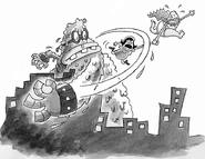 Melvin's growth and anger destroys the building and the various things surrounding the building, and he kidnaps Miss Anthrope before storming out to the city.