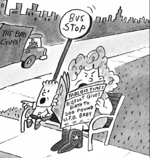 Tabloid Times is the newspaper that a little boy’s mother was reading. The newspaper was seen in The Adventures of Captain Underpants.