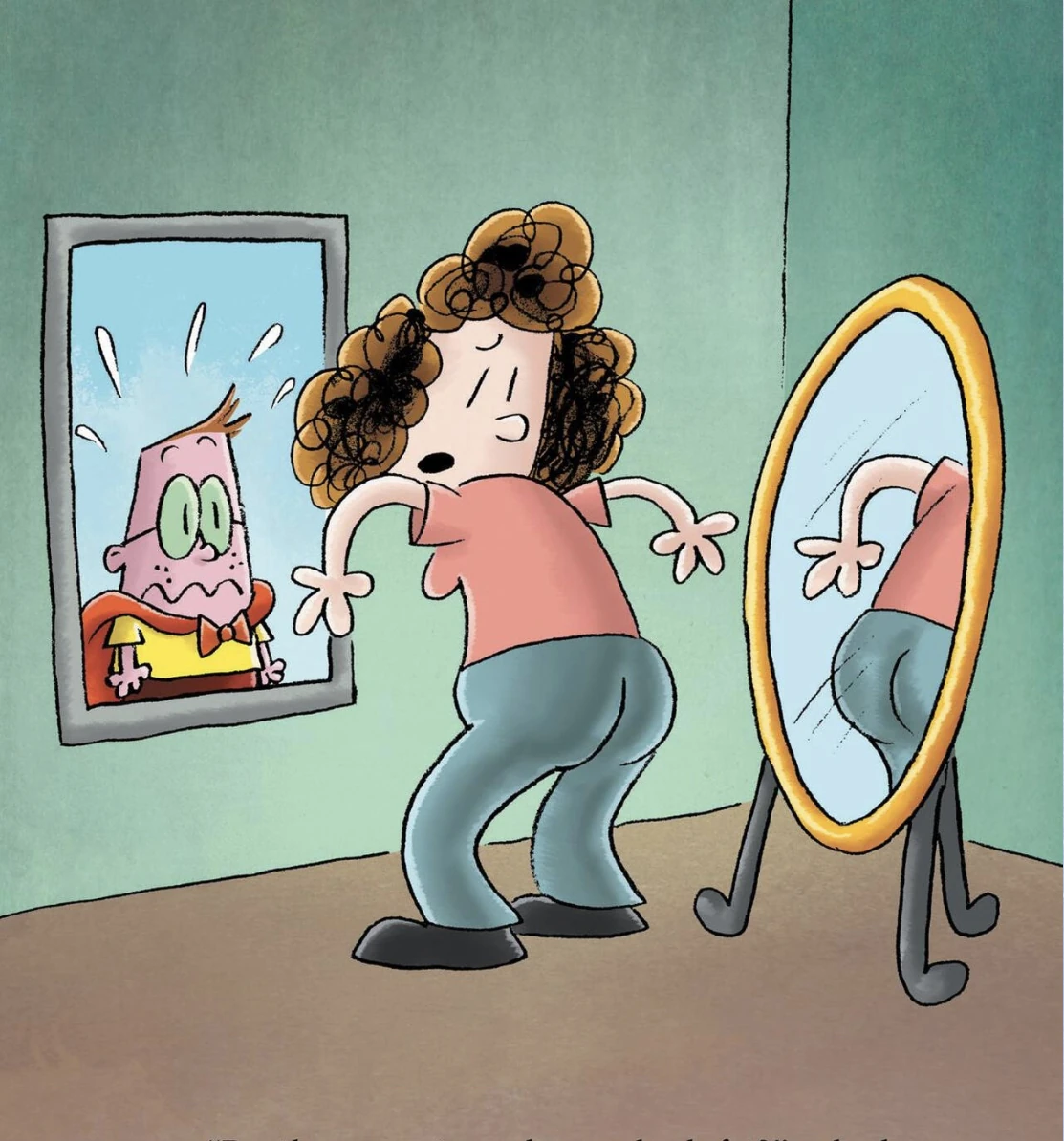 The Middle-Aged Woman has fair skin, orange-black curly hair, and black eyes. She wears a pink shirt and a pair of blue jeans that make her butt look big.